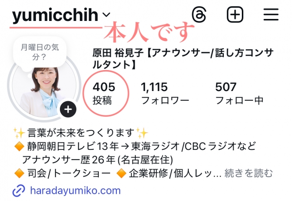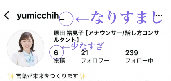Instagramで、原田裕見子の名前と写真を使った、なりすましのアカウントが見つかりました。